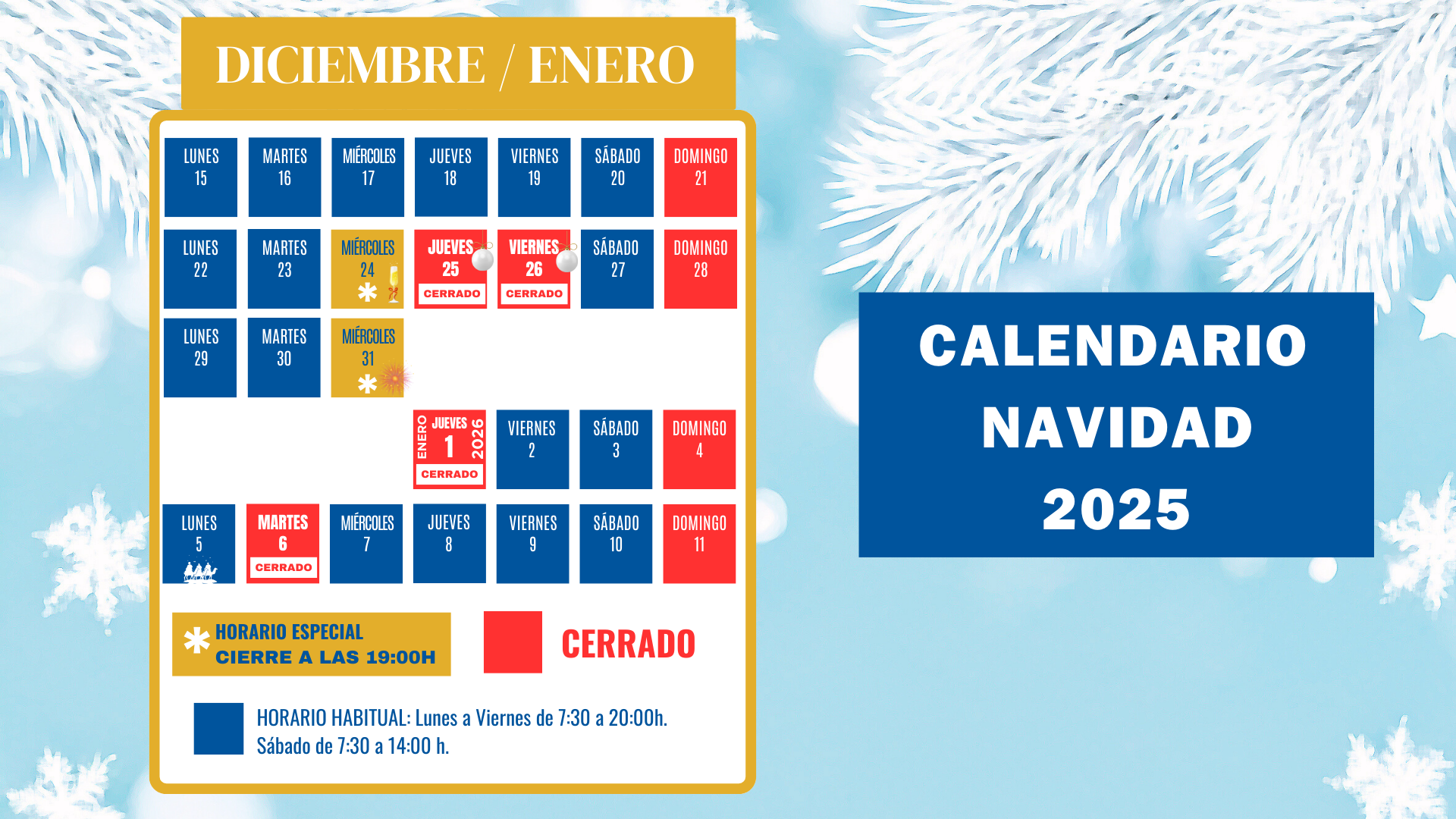 Horario: Lunes a viernes de 7,30 a 20 horas. Sábados de 7,30 a 14 horas.